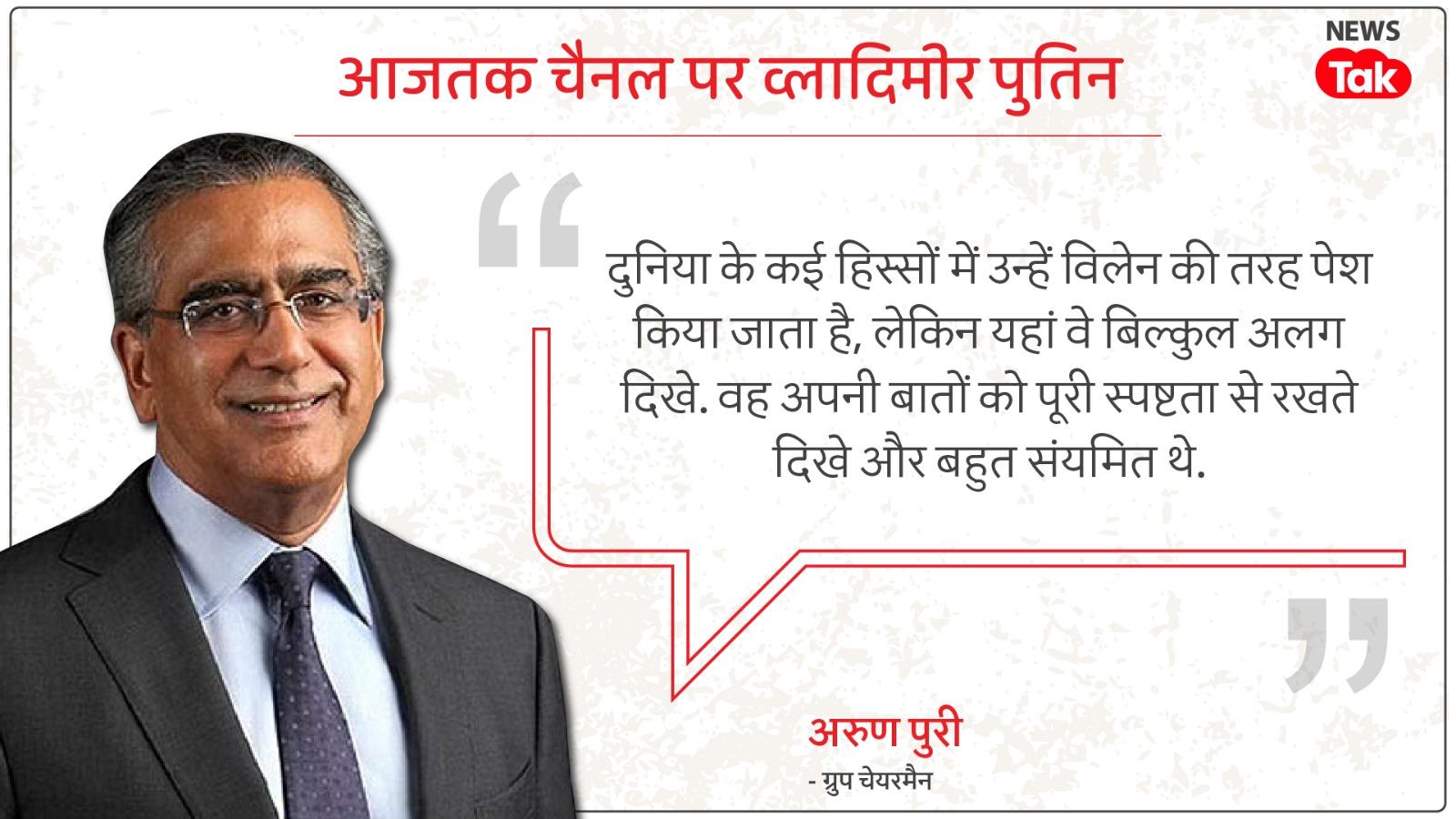 अरुण पुरी ने रूसी राष्ट्रपति के शांत स्वभाव का जिक्र किया. उन्होंने कहा कि पुतिन दुनिया के कुछ हिस्सों में भले ही एक 'विलेन' की तरह पेश किए जाते हों, लेकिन इंटरव्यू के दौरान वे बिल्कुल स्पष्ट और संयमित दिखे.