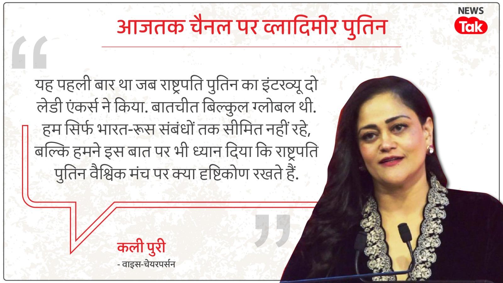 इंडिया टुडे ग्रुप की वाइस-चेयरपर्सन कली पुरी ने बताया कि यह पहली बार है कि जब पुतिन का इंटरव्यू दो महिला एंकर्स ने किया. उन्होंने कहा, बातचीत सिर्फ भारत-रूस संबंधों तक सीमित नहीं थी, बल्कि वैश्विक दृष्टिकोण पर भी चर्चा हुई.