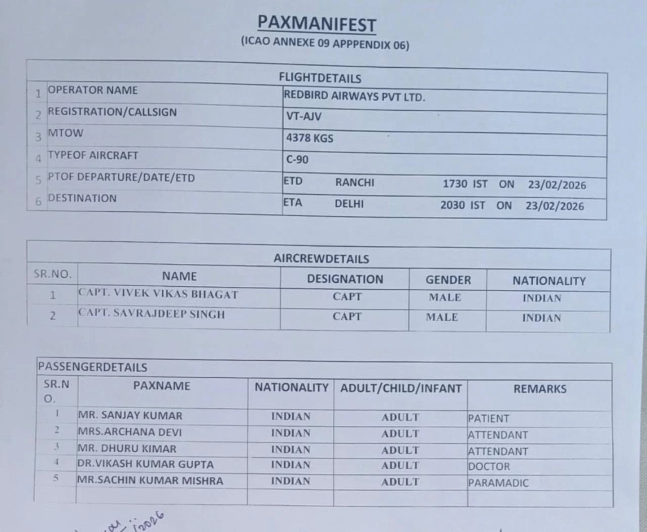 DGCA के अनुसार, 23 फरवरी 2026 को रेडबर्ड एयरवेज प्राइवेट लिमिटेड का बीचक्राफ्ट C90 एयरक्राफ्ट (VT-AJV), जो “रांची-दिल्ली” सेक्टर पर मेडिकल इवैक्युएशन (एयर एम्बुलेंस) फ्लाइट ऑपरेट कर रहा था, झारखंड के चतरा जिला की कसारिया पंचायत में दुर्घटनाग्रस्त हो गया. विमान में दो क्रू मेंबर समेत कुल सात लोग सवार थे. विमान ने 19:11 पर रांची से उड़ान भरी थी. कोलकाता से संपर्क में रहते हुए, विमान ने खराब मौसम के कारण मार्ग बदलने का अनुरोध किया. 19:34 पर कोलकाता के साथ संचार और वाराणसी से लगभग 100 नॉटिकल माइल दक्षिण-पूर्व में रडार संपर्क टूट गया था.