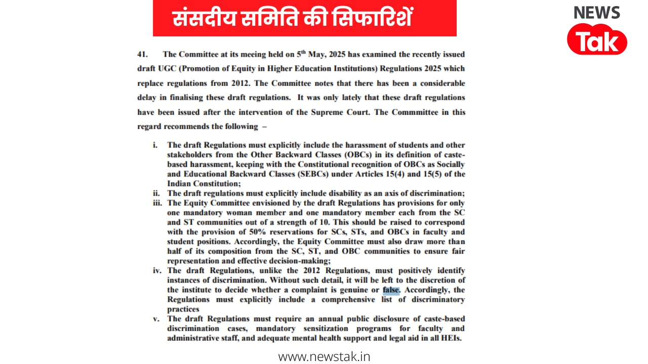 पहली सिफारिश यह थी कि भेदभाव की शिकायतों की जांच करने वाली समिति में SC, ST और OBC वर्ग के सदस्यों की संख्या आधे से ज्यादा होनी चाहिए,