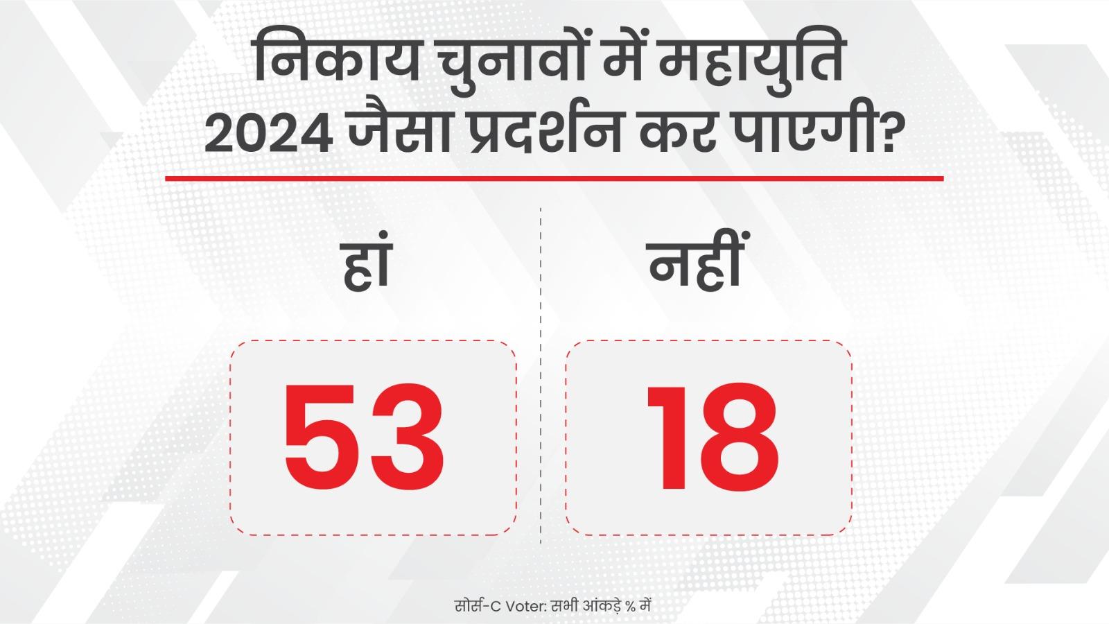 सर्वे में शामिल 53 प्रतिशत लोगों ने पूरे भरोसे के साथ "हां" में जवाब दिया है. उनका मानना है कि महायुति एक बार फिर शानदार प्रदर्शन करेगी. वहीं, केवल 18 प्रतिशत लोग ऐसे हैं जिन्हें लगता है कि इस बार गठबंधन को वैसी सफलता नहीं मिलेगी.