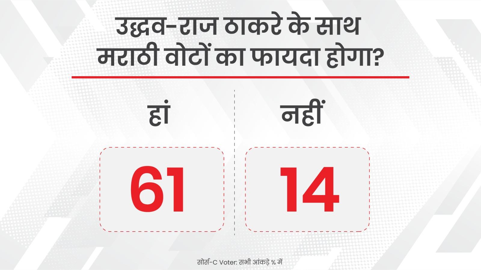 राज ठाकरे और उद्धव ठाकरे के एक साथ आने को भी अहम माना गया है. 61 प्रतिशत लोगों का कहना है कि इससे मराठी वोटों का फायदा मिलेगा. केवल 14 प्रतिशत लोगों को लगता है कि इसका कोई खास असर नहीं पड़ेगा. हाल के दिनों में दोनों नेताओं की मुलाकातों को लेकर काफी चर्चा भी हुई है.