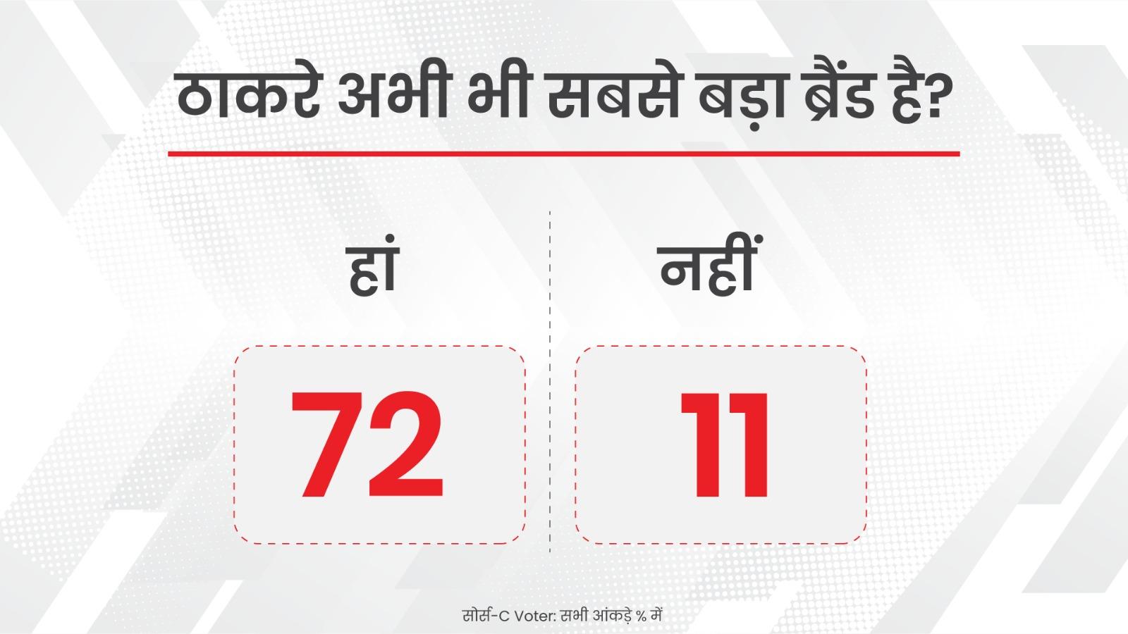 ठाकरे परिवार को लेकर भी सवाल पूछा गया. 72 प्रतिशत लोगों ने माना कि ठाकरे नाम आज भी महाराष्ट्र की राजनीति में बड़ा ब्रांड है.