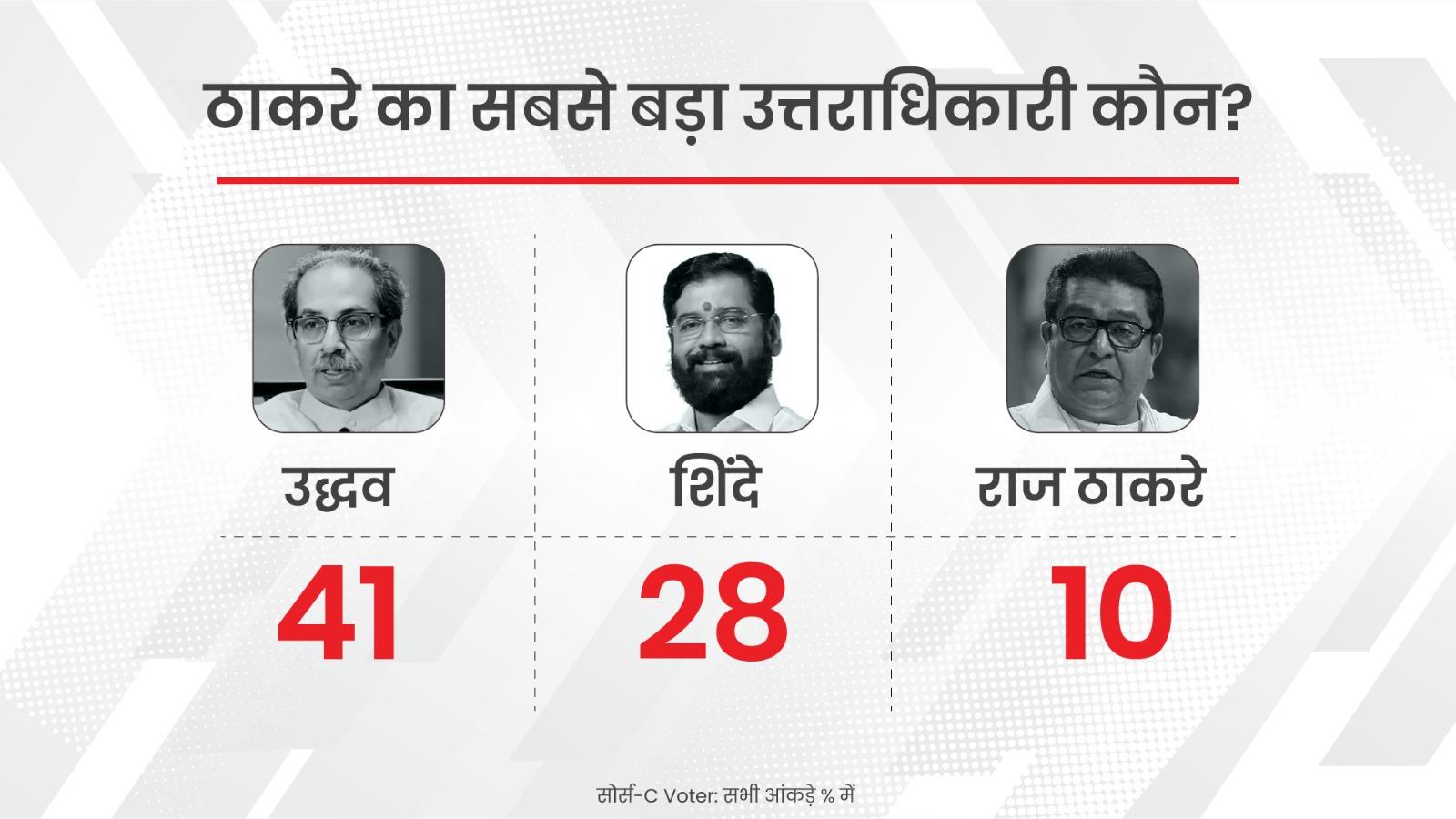 जब उत्तराधिकार की बात आई तो 41 प्रतिशत लोगों ने उद्धव ठाकरे को सबसे आगे माना. 28 प्रतिशत लोगों ने एकनाथ शिंदे का नाम लिया और 10 प्रतिशत ने राज ठाकरे का समर्थन किया.