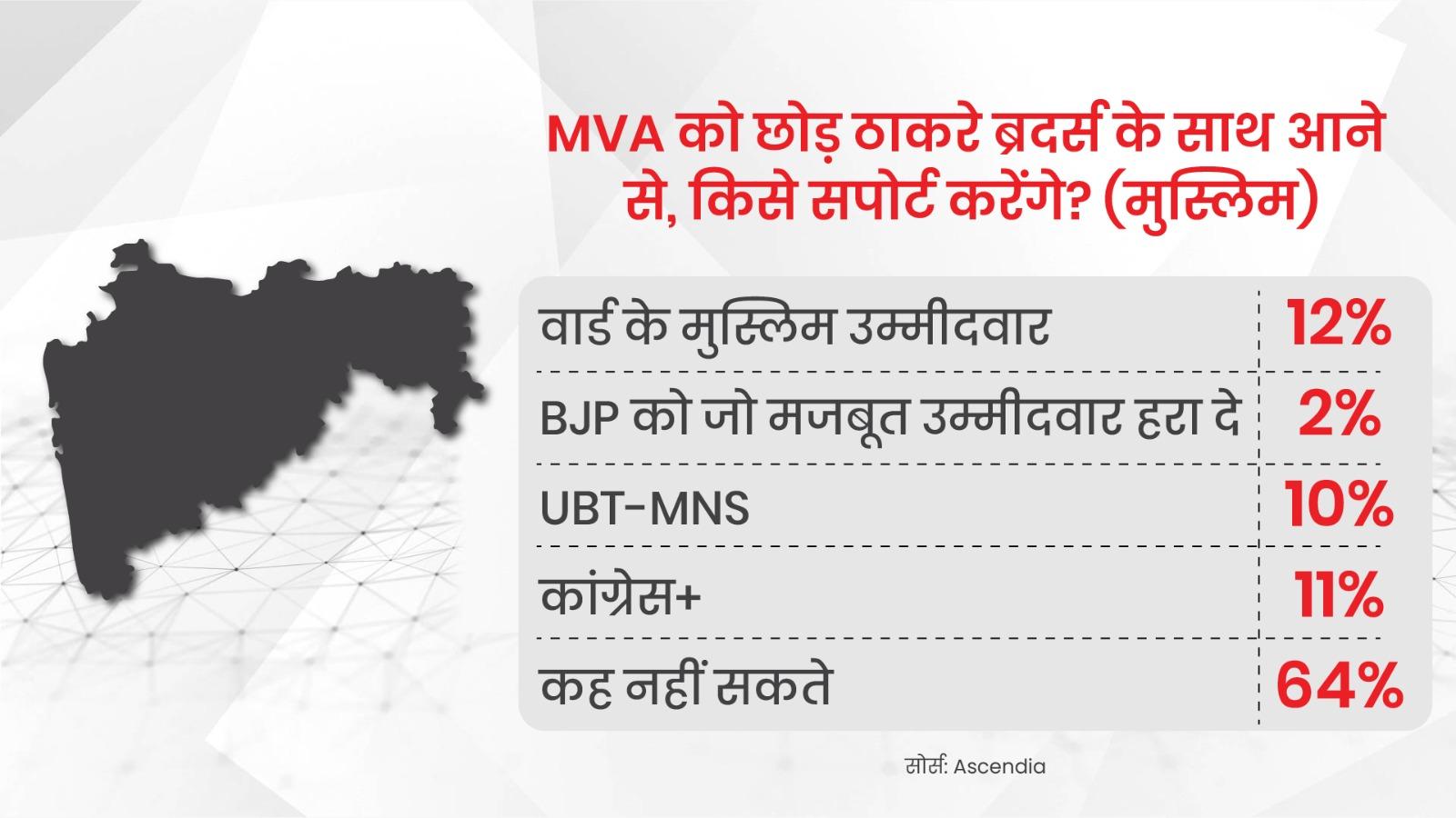 सर्वे के मुताबिक, मुस्लिम बहुल इलाकों में लोगों से पूछा गया कि अगर उद्धव ठाकरे और राज ठाकरे साथ आते हैं तो वे किसे सपोर्ट करेंगे.