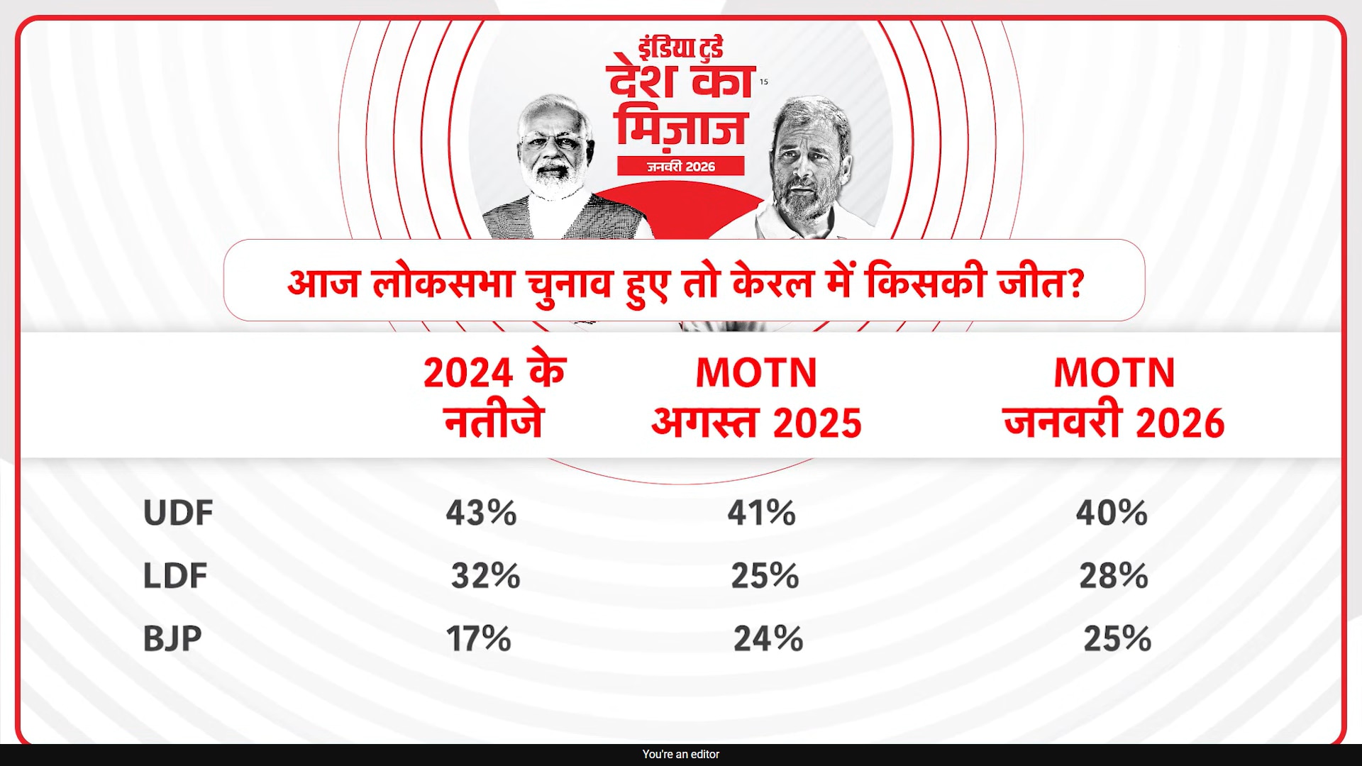 India Today Mood of the Nation Survey: केरल विधानसभा चुनाव की सुगबुगाहट के बीच आए 'मूड ऑफ द नेशन' सर्वे ने राजनीतिक गलियारों में हलचल मचा दी है. लोकसभा सीटों को लेकर किए गए इस सर्वे में यूडीएफ का दबदबा बरकरार है, जबकि एलडीएफ और बीजेपी के बीच सीटों का गणित बदलता दिख रहा है.
