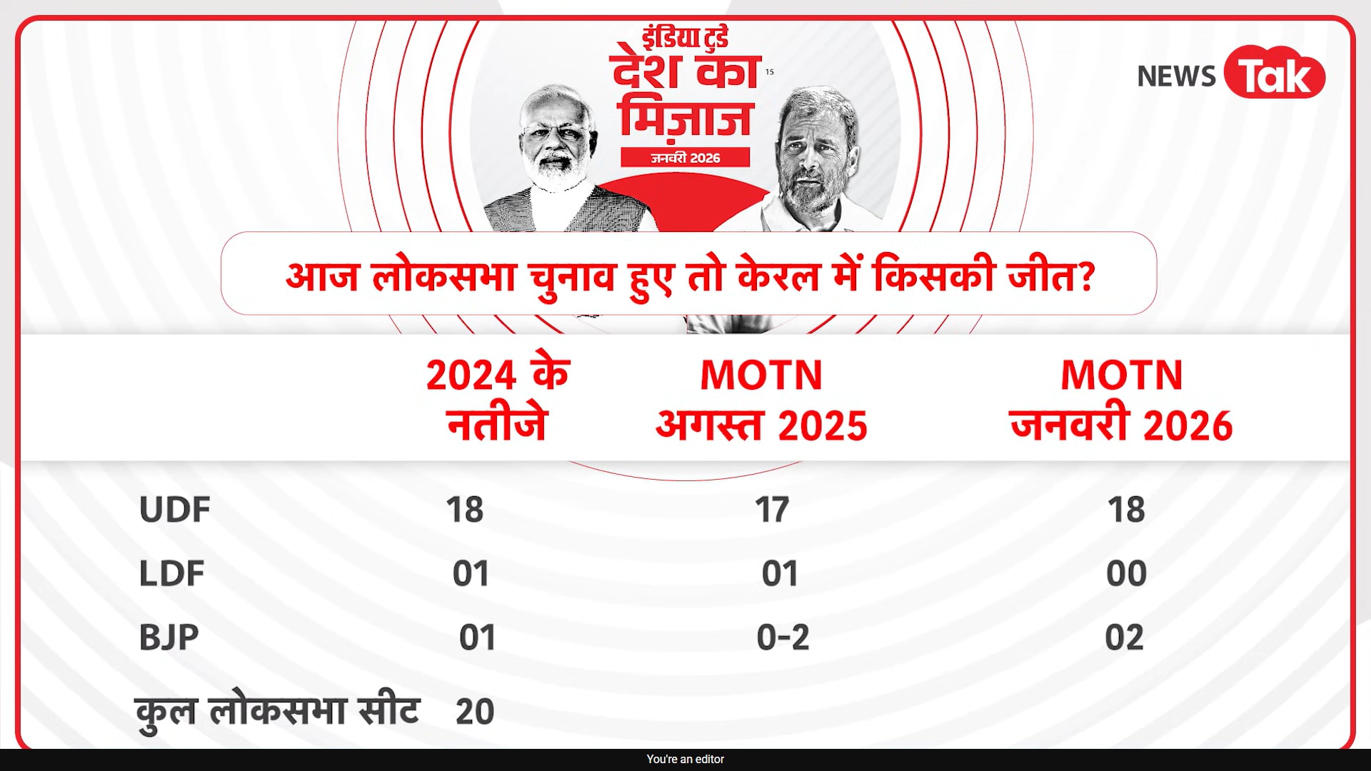 MOTN Kerala Survey: केरल में विधानसभा चुनाव का बिगुल बजने वाला है. इससे ठीक पहले अब लोकसभा चुनाव को लेकर इंडिया टुडे के 'मूड ऑफ द नेशन' (MOTN) ने एक सर्वे (जनवरी 2026) जारी किया है. सर्वे में लोगों से ये जानने की कोशिश की गई है कि अगर आज लोकसभा चुनाव होते हैं तो केरल की जनता किस गठबंधन पर अपना भरोसा जताएगी. इस दौरान सर्वे में चौंकाने वाले आंकड़े सामने आए हैं. इन ताजा आंकड़े में यूडीएफ, एलडीएफ और बीजेपी के बीच सीटों और वोट शेयर का समीकरण काफी बदलता हुआ नजर आ रहा है.