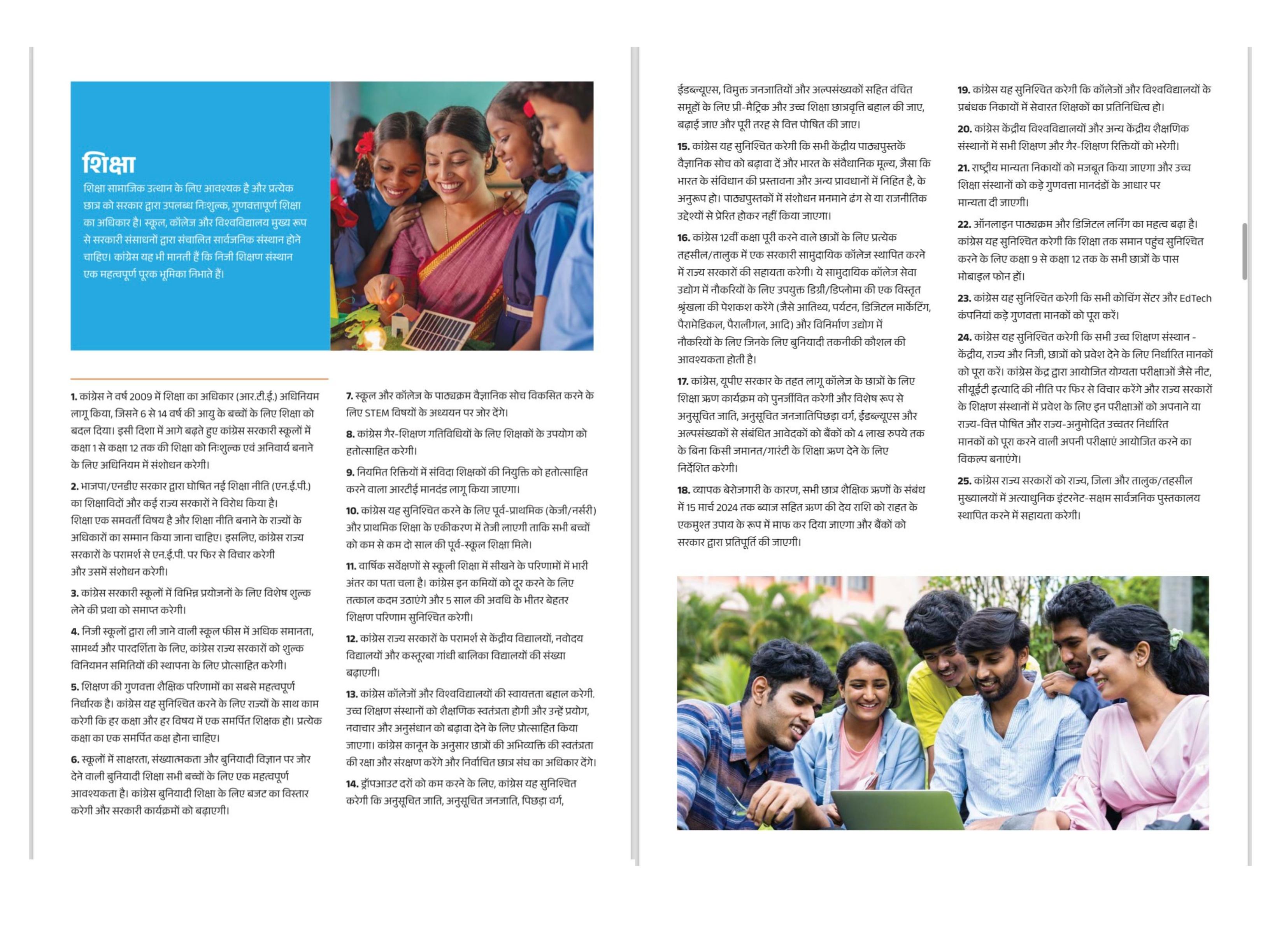 9- OBC , SC और ST छात्रों के लिए स्कॉलरशिप की धनराशि दोगुनी की जाएगी, खासकर हाइयर एजुकेशन के लिए. SC और ST छात्रों को विदेश में पढ़ने में सहायता और उनके लिए पीएचडी करने के लिए स्कॉलरशिप की संख्या दोगुनी की जाएगी.
