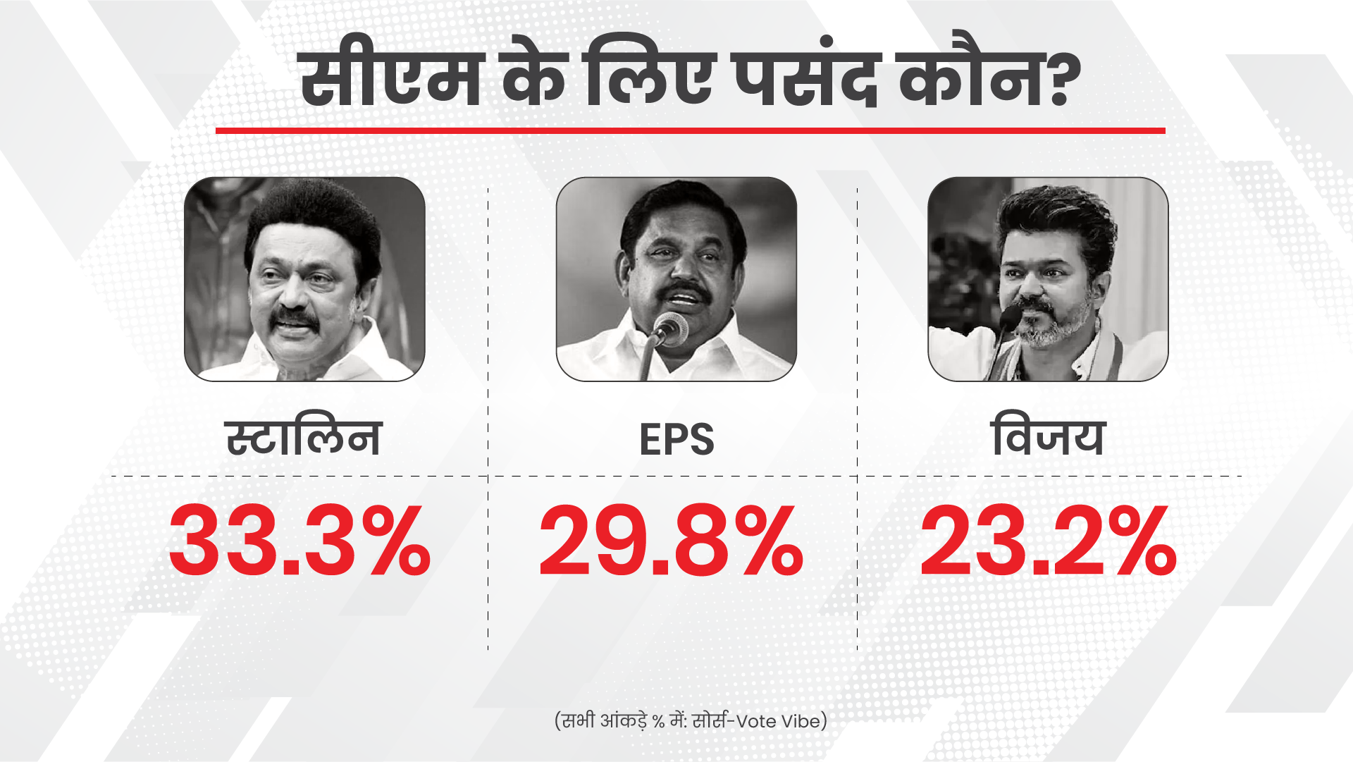 इस सर्वे में तमिनलाडु की जनता से कई तरह के सवाल किए गए है. इन्हीं में से एक सवाल था कि आप तमिलनाडु का सीएम(मुख्यमंत्री) किसे देखना चाहते है? इसके जवाब में 33.3% लोगों ने DMK+ के एम. के. स्टालिन को अपनी पहली पसंद बताई है. वहीं 29.8% लोगों ने AIDMK+ के पलानी स्वामी(EPS) को पसंदीदा सीएम चेहरा बताया. वहीं विजय थलापति के पक्ष में 23.2% लोग दिखें, जो उन्हें तमिलनाडु का मुख्यमंत्री बनाना चाहते है. तो इस सर्वे के मुताबिक स्टालिन अभी भी पहली पोजिशन पर है.
