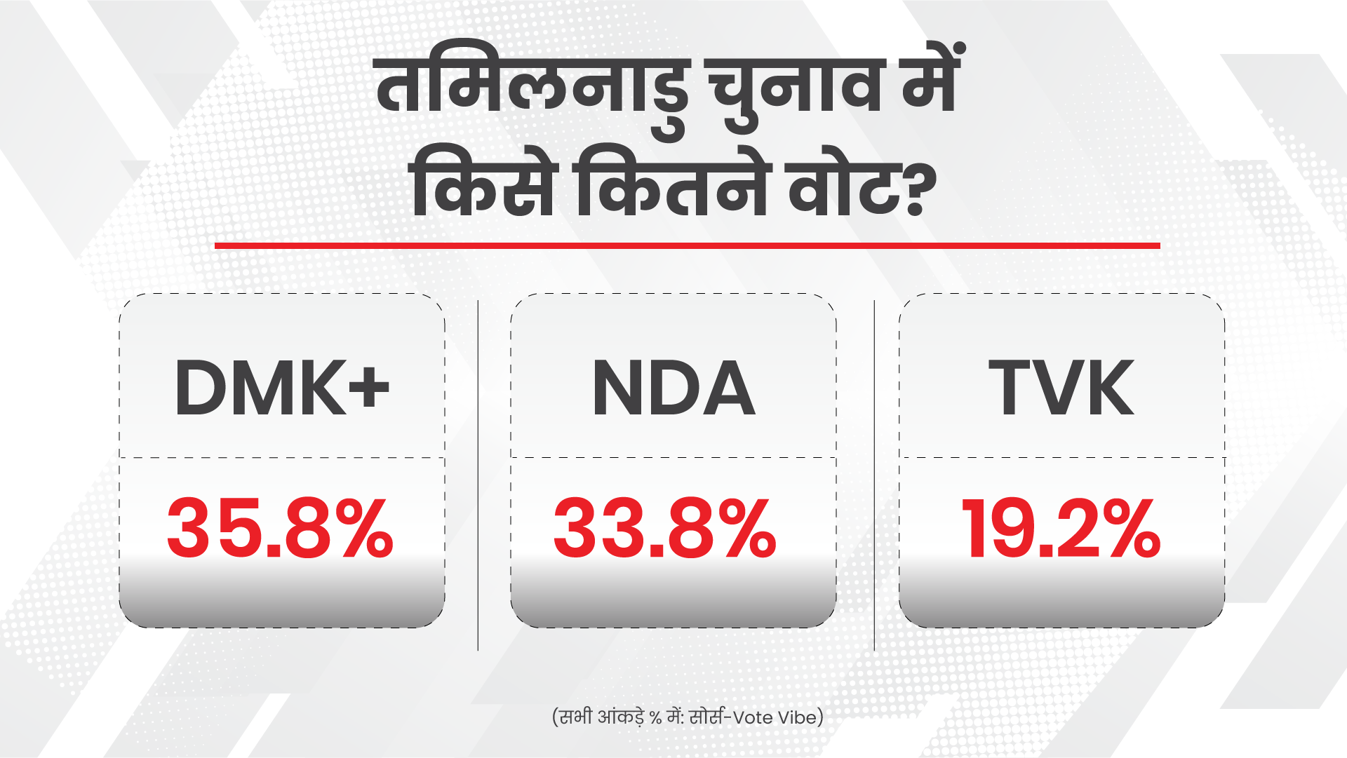 साल 2026 में तमिनलाडु में विधानसभा चुनाव होने वाले हैं. भले ही अभी तक चुनाव की तारीखों को लेकर कोई घोषणा नहीं हुई है लेकिन राज्य का राजनीतिक पारा अपने चरम पर पहुंच गया है. तमिलनाडु की बात करें तो राज्य में कुल 234 विधानसभा सीटें है और मुख्य रूप से दो गठबंधन DMK+ और AIDMK+ के बीच सत्ता की लड़ाई होती थी. लेकिन इस बार एक तीसरा मोर्चा विजय थलापति की भी खूब चर्चा हो रही है कि आखिर इस बार वो क्या कमाल कर सकते है या फिर उनका बिहार में प्रशांत किशोर जैसा हाल हो जाएगा. इसी बीच Vote Vibe का ताजा सर्वे सामने आया है, जिसके नतीजे बेहद चौंकाने वाले है. आइए विस्तार से जानते हैं तमिनलाडु की जनता का क्या है मूड?
