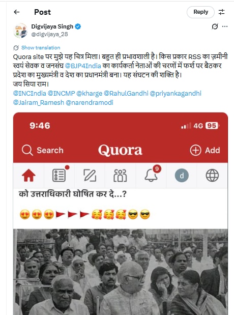 बैठक से पहले ही दिग्विजय सिंह का एक सोशल मीडिया पोस्ट कांग्रेस के लिए परेशानी का सबब बन गया था. उन्होंने X पर प्रधानमंत्री नरेंद्र मोदी की एक पुरानी तस्वीर साझा करते हुए RSS और बीजेपी की संगठनात्मक ताकत की तारीफ की थी. उन्होंने लिखा कि कैसे जमीन से जुड़े कार्यकर्ता मुख्यमंत्री और प्रधानमंत्री जैसे पदों तक पहुंचे. यह संगठन की असली ताकत है.