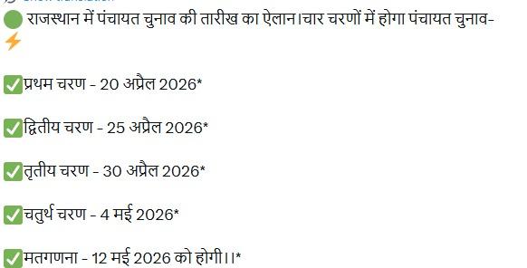 Rajasthan Panchayat Election 2026: राजस्थान में शनिवार से सोशल मीडिया पर पंचायत चुनाव की तारीखों से जुड़ा एक मैसेज खूब वायरल हो रहा है. इस मैसेज में दावा किया जा रहा है कि चुनाव चार चरणों में होंगे, जिसकी शुरुआत 20 अप्रैल 2026 से होगी और मतगणना 12 मई को की जाएगी. हालांकि, राजस्थान राज्य चुनाव आयोग ने अब तक चुनाव की ऐसी किसी भी तारीख का आधिकारिक ऐलान नहीं किया है.