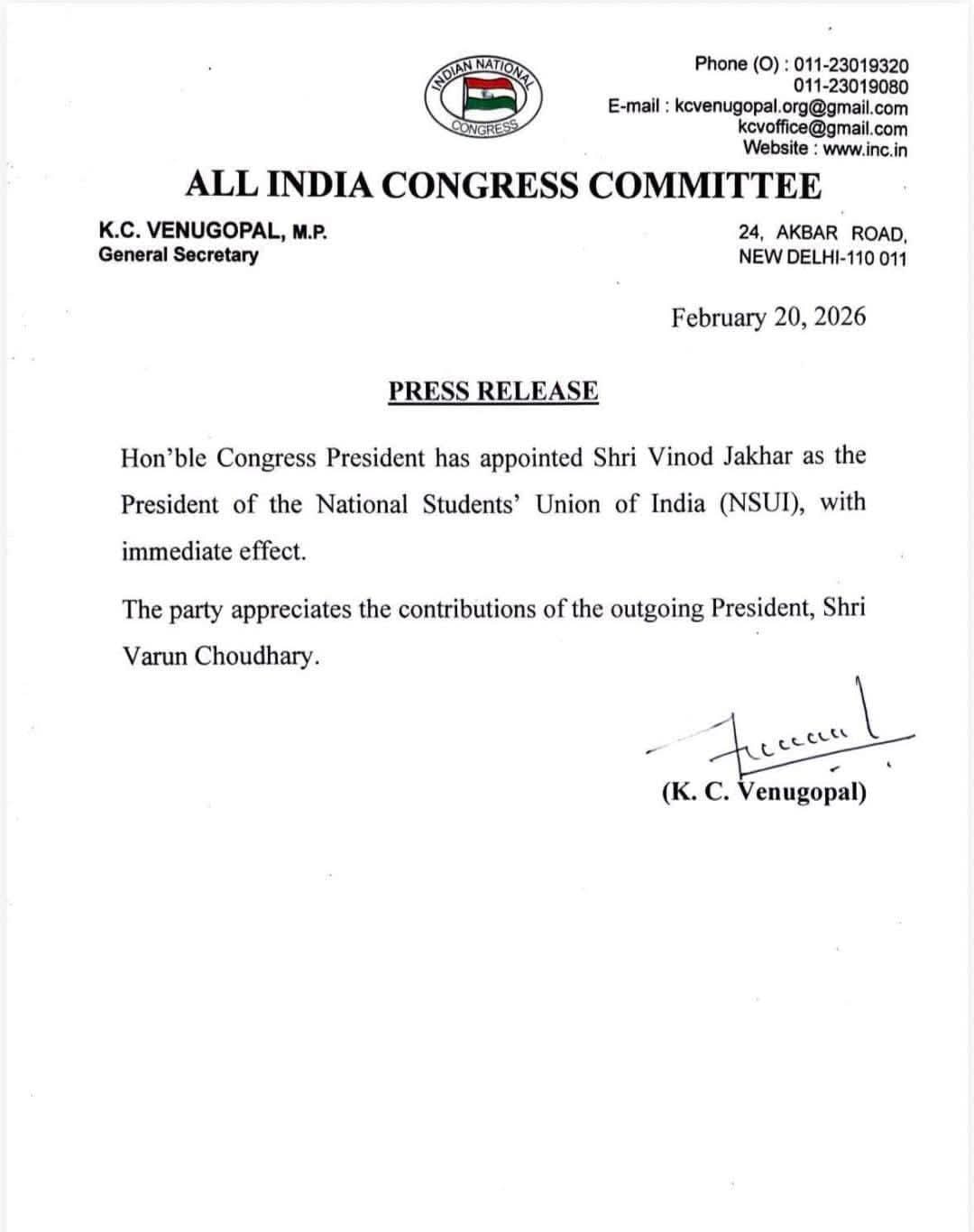 यह जानकारी 20 फरवरी 2026 को जारी आधिकारिक प्रेस रिलीज में दी गई. प्रेस रिलीज में बताया गया है कि पार्टी ने यह फैसला संगठन को मजबूत करने और छात्र राजनीति में नई ऊर्जा लाने के उद्देश्य से लिया है. साथ ही कांग्रेस नेतृत्व ने निवर्तमान अध्यक्ष वरुण चौधरी के योगदान की सराहना भी की है. पार्टी ने उनके कार्यकाल में किए गए कामों की प्रशंसा करते हुए उन्हें धन्यवाद दिया है.