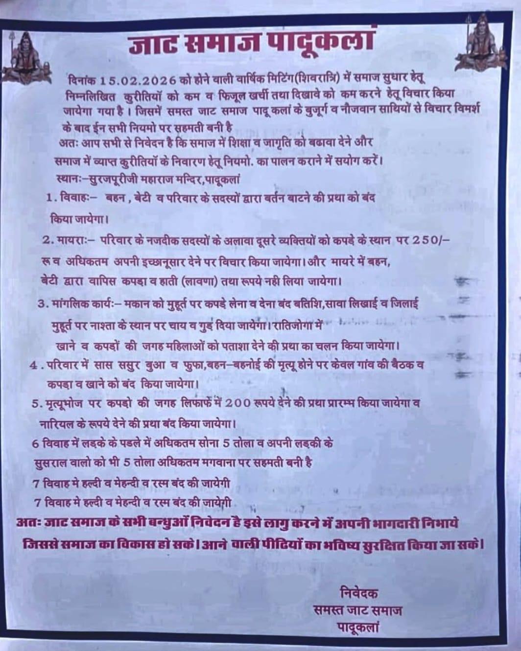 मकान के मुहूर्त पर कपड़े लेने-देने की परंपरा बंद की जाएगी. बत्तीसी, सावा लिवाड़ और जिलाई जैसे अवसरों पर भारी नाश्ते की जगह केवल चाय और गुड़ परोसने का निर्णय हुआ है.
