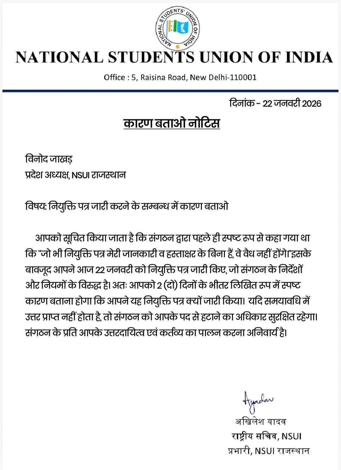 राजस्थान NSUI के अध्यक्ष विनोद जाखड़ को बिना अनुमति नियुक्तियां करने पर कारण बताओ नोटिस मिला है. राष्ट्रीय प्रभारी अखिलेश यादव ने उनसे 2 दिन में जवाब मांगा है. संतोषजनक जवाब न मिलने पर उन्हें पद से हटाया जा सकता है.