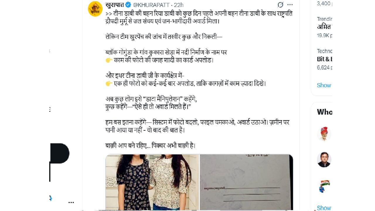 राष्ट्रपति द्रौपदी मुर्मू के हाथों 'कैच द रेन' अवार्ड लेकर बाड़मेर लौटीं कलेक्टर टीना डाबी विवादों में आ गई हैं. इस अवार्ड को लेकर सोशल मीडिया पर सवाल खड़े हो गए हैं. इधर सोशल मीडिया पर वायरल हो रहे आरोपों को लेकर टीना डाबी ने मंगलवार को प्रेस कॉन्फ्रेंस की. उन्होंने सोशल मीडिया पर चल रहे आरोपों और झूठा और भ्रामक बताया.