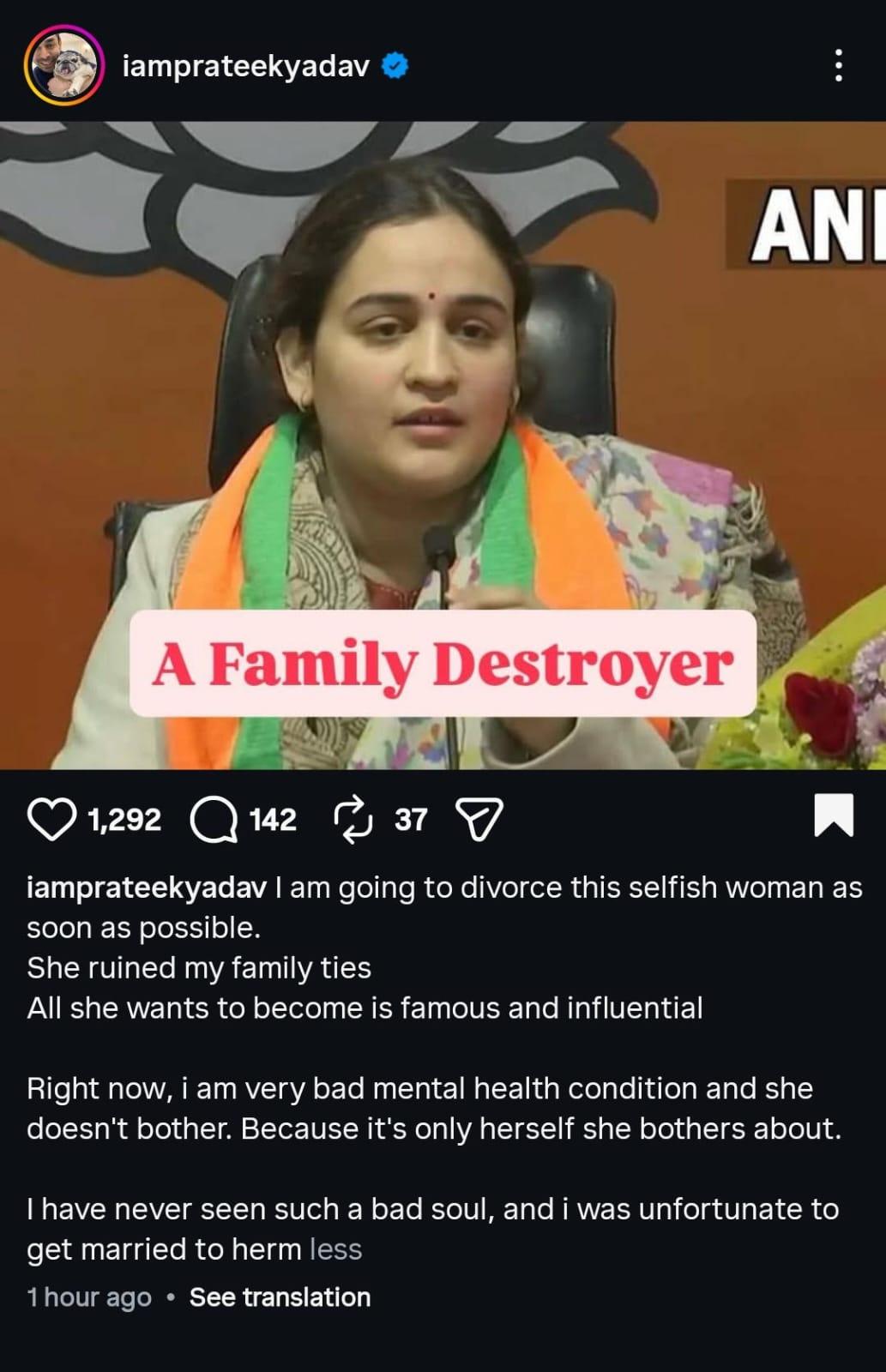 दरअसल, प्रतीक यादव के इंस्टाग्राम अकाउंट iamprateekyadav से एक पोस्ट किया गया था. इसने सभी को चौंका दिया था. इस पोस्ट में अपर्णा यादव की तस्वीर के साथ लिखा गया था प्रतीक यादव ने लिखा था कि वे से जल्द तलाक की प्रक्रिया पूरी करना चाहते हैं. वे अब इस रिश्ते को आगे नहीं बढ़ाना चाहते और अलग होने का फैसला कर चुके हैं.