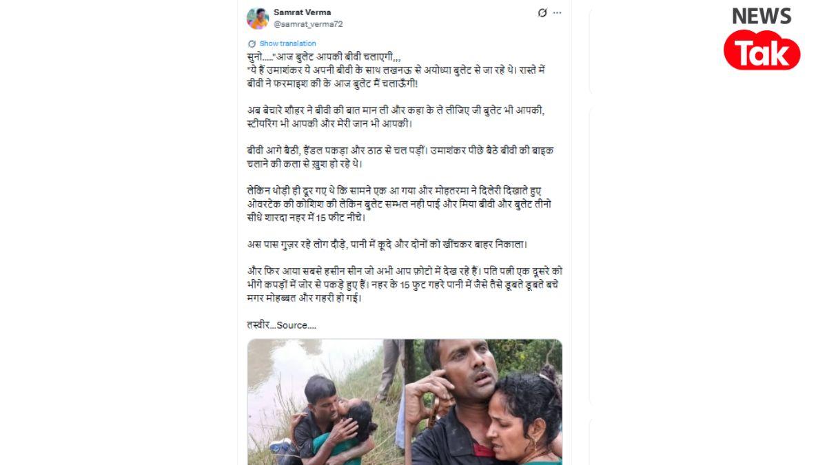 सोशल मीडिया पर बताया जा रहा है कि ये घटना शारदा नहर में हुई. ये युवक-युवती दरअसल पति-पत्नी हैं. बुलेट पर सवार होकर लखनऊ से अयोध्या जा रहे थे. बीच रास्ते में पत्नी ने बाइक चलाने की मंशा जाहिर की और पति उमाशंकर ने खुशी-खु्शी बाइक दे भी दी. सोशल मीडिया पर दावा किया जा रहा है कि अचानक सामने से एक कार आई और पत्नी से बाइक नहीं संभली. बाइक सीधे शारदा नहर में जा गिरी. पति-पत्नी दोनों को गिरते देख आसपास के लोग दौड़े और उन्हें बचा लिया. 15 फीट गहरे पानी में डूबते-डूबते दोनों बचे और उनकी मोहब्बत और गहरी हो गई.