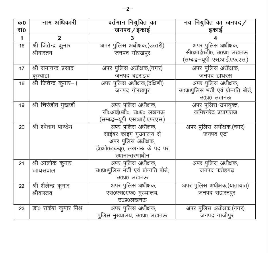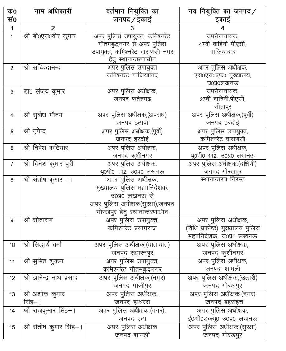 गृह विभाग की ओर से जारी लिस्ट के अनुसार कमिश्नरेट गौतमबुद्धनगर से एस एस वी कुमार को अपर पुलिस उपायुक्त को उप सेनानायक 47वीं बटालियन पीएसी गाजियाबाद बनाया गया है. संजय कुमार को फतेहगढ़ से ट्रांसफर कर उप सेनानायक 27वीं बटालियन पीएसी सीतापुर भेजा गया है. वहीं, चिरंजीव मुखर्जी को अपर पुलिस अधीक्षक CID लखनऊ के पद पर तबादला कर अब प्रयागराज कमिश्नरेट में अपर पुलिस उपायुक्त बनाए गए हैं.