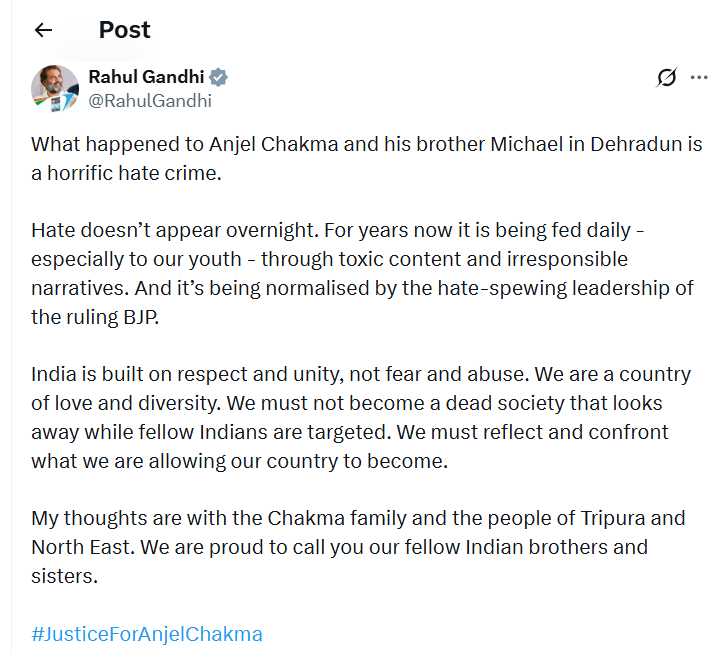 ऐंजल चकमा की मौत राहुल गांधी ने सोशल मीडिया प्लेटफार्म एक्स पर पोस्ट करते हुए कहा कि देहरादून में एंजेल चकमा और उनके भाई माइकल के साथ जो हुआ, वह एक भयानक नफरत का अपराध है. उन्होंने कहा कि नफरत रातों-रात पैदा नहीं होती. सालों से इसे रोज बढ़ावा दिया जा रहा है-खासकर हमारे युवाओं को जहरीले कंटेंट और गैर-जिम्मेदार कहानियों के जरिए. राहुल ने कहा कि सत्ताधारी BJP के नफरत फैलाने वाले नेताओं द्वारा इसे नॉर्मल बनाया जा रहा है. भारत सम्मान और एकता पर बना है, डर और गाली-गलौज पर नहीं.