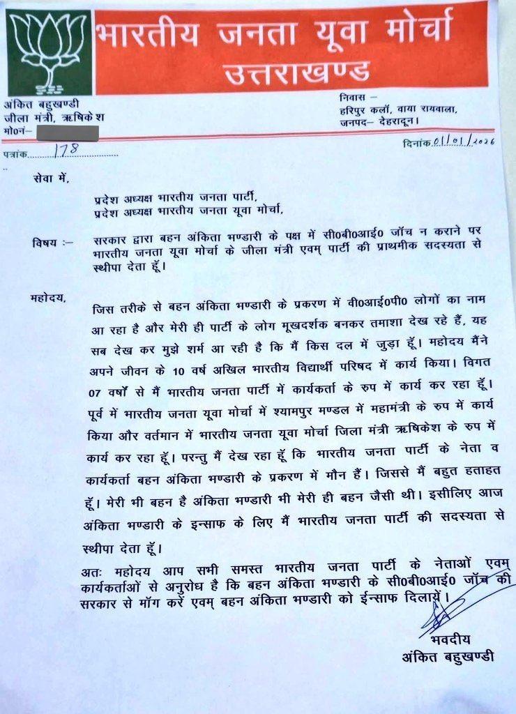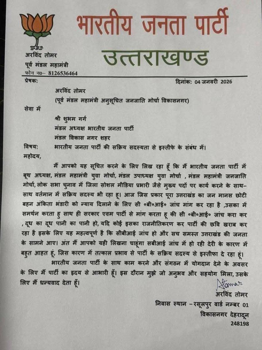 वहीं अरविंद तोमर ने अपने इस्तीफा में लिखा कि मैं छोटी बहन अंकिता भंडारी को न्याय दिलाने के लिए सीबीआई जांच मांग का समर्थन करता हूं. इसके साथ ही सरकार और पार्टी से मांग करता हूं कि मामले की सीबीआई जांच करा कर दूध का दूध पानी का पानी किया जाए. मामले के राजनीतिकरण से पार्टी की छवि खराब हो रही है.