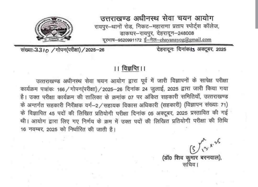 बता दें कि इस एग्जाम के लिए UKSSSC ने 09 अप्रैल 2025 को नोटिफिकेशन निकाला था. इसके लिए लिखित परीक्षा 21 सितंबर 2025 को आयोजित की गई थी. हालांकि, परीक्षा समाप्त होने के करीब डेढ़ घंटे बाद, यानी लगभग 01:30 बजे कुछ प्रश्न पत्रों के फोटो सोशल मीडिया पर तेजी से वायरल हो गए थे. इसके बाद से ही छात्र इस एग्जाम को रद्द करने की मांग कर रहे थे.