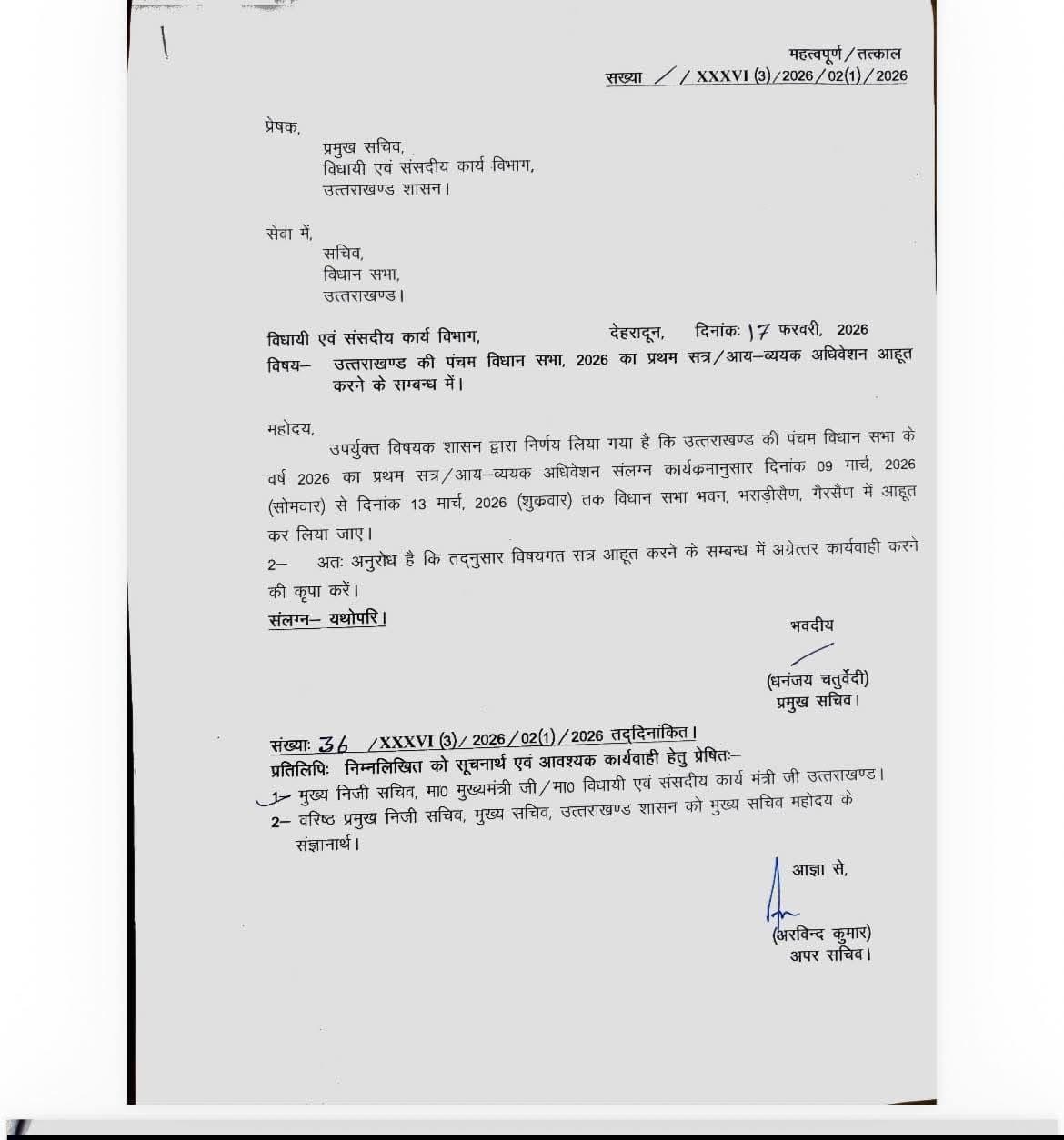 उत्तराखंड विधानसभा का सत्र 09 मार्च 2026 सोमवार से शुरू होगा और 13 मार्च 2026 शुक्रवार तक चलेगा. पांच दिनों तक चलने वाले इस सत्र की शुरुआत राज्यपाल के अभिभाषण से होगी, जिसके बाद अध्यादेशों और विभिन्न विभागों की अनुदान मांगों पर विस्तृत चर्चा की जाएगी. वही मुख्यमंत्री पुष्कर सिंह धामी 11 मार्च को वित्तीय वर्ष 2026-27 का बजट सदन में पेश करेंगे. सत्र के दौरान कई महत्वपूर्ण विधायी कार्यों को निपटाया जाएगा.
