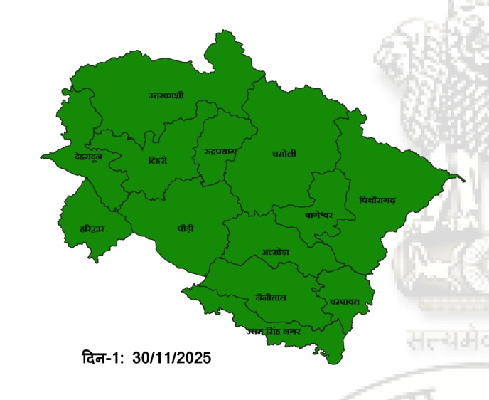 मौसम विज्ञान केंद्र देहरादून के अनुसार प्रदेश में आज 30 नवंबर यानी रविवार को प्रदेश के सभी जिलों में मौसम के शुष्क रहने की संभावना जताई गई है. वहीं, IMD ने आज उत्तराखंड के किसी भी जिले के लिए कोई अर्लट जारी नहीं किया है. हालांकि, पहाड़ी इलाकों में कहीं-कहीं पाला पड़ने और मैदानी क्षेत्रों में कोहरा छाने की संभावना जताई है. बता दें कि इस समय प्रदेश के कुछ जिलों में सुबह और शाम के समय ठंड से ठिठुरन होने लगी है. हालांकि, दोपहर के समय धूप के निकलने से राहत है.